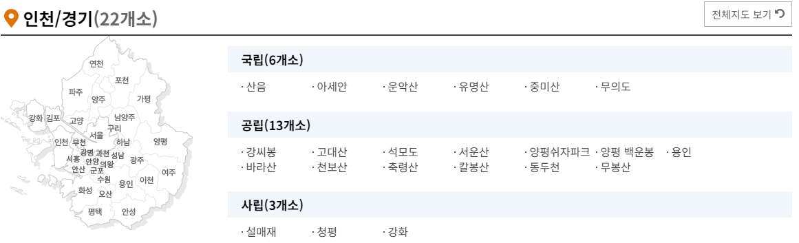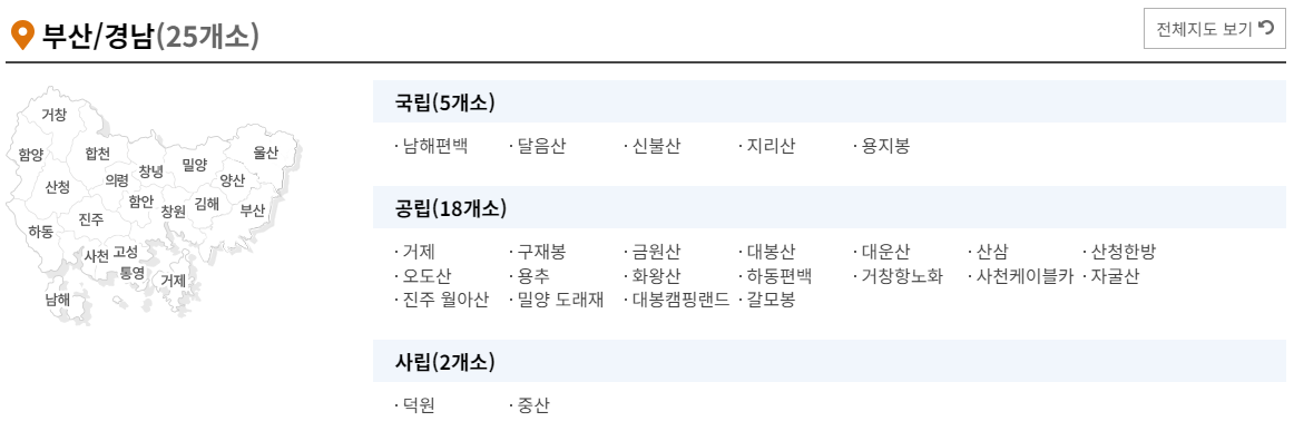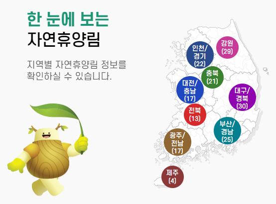 | 지역 | 휴양림 이름 | 주요 특징 |